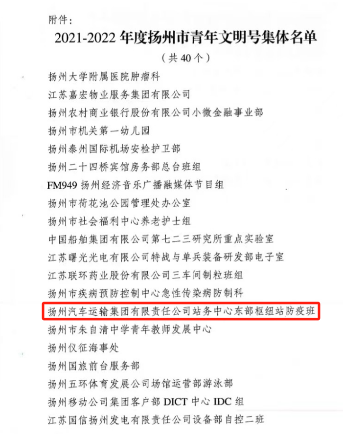 揚(yáng)汽集團(tuán)東部樞紐汽車站防疫班榮獲青年文明號(hào)集體榮譽(yù)稱號(hào)